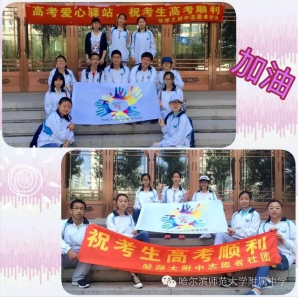 6月7日和8日,哈师大附中志愿者社团20余名社员,在社长吕泓诺同学,副社长叶爽同学的带领下,进行了为期2天的高考爱心志愿活动。