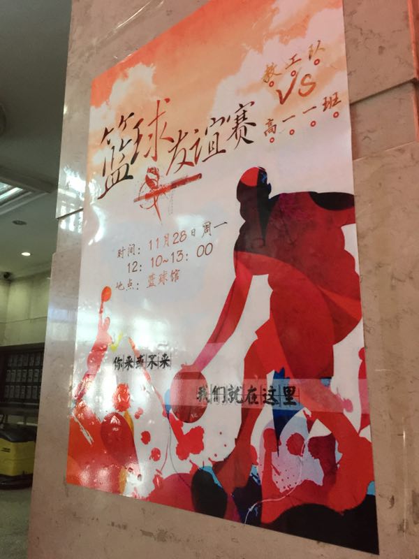 和三班比赛那天,教学楼里就张贴了大大的海报,引来了很多篮球爱好者前来观战。一场比赛点燃了师生的热情,于是,其他班级也开始纷纷“约战”。而此时,一个新的计划正在酝酿。学校办公室副主任张彦宝老师提出了一个想法:打篮球不应该只是玩,更应该让其成为督促学生进步的方法。学年主任张苑勋老师拍案叫绝,立刻研究激励方案。大宝老师和苑勋老师都是篮球队成员,有此想法是长期全身心工作的结果。大家一致认为,热爱运动的同学应该是全面发展的代表,所以,上场的运动员必须也是学习中的佼佼者或积极进取者,那么,篮球队要对学生运动员的学习成绩进行跟踪,积极督促其进步、全面发展。