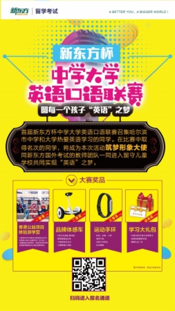 首届新东方杯中学大学英语口语联赛召集哈尔滨市中学和大学热爱英语学习的同学。在比赛中取得名次的同学,将成为本次活动筑梦形象大使同新东方国外考试的教师团队一同进入留守儿童学校共同实现“英语”之梦。