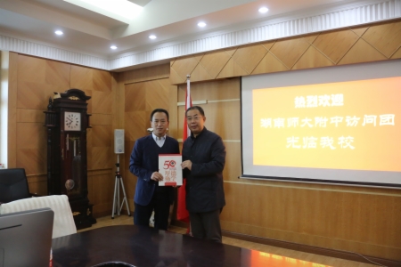 2017年11月16日(星期四),湖南师范大学附属中学访问团在办公室莫晖主任和语文教研室厉行威主任的带领下,一行36人到我校访问参观,校党委书记付琪主持了欢迎仪式,刘大伟校长代表学校与湖南师范大学附属中学领导互赠了礼物,刘振成副校长、张玉平主任出席了欢迎仪式。