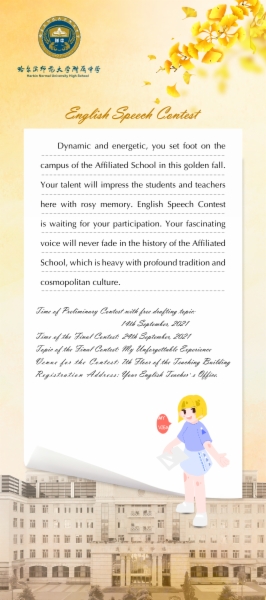 9月14日英语教研室在逸夫楼七楼会议室给2021级高一新生提供了一个指点江山、激扬文字的舞台——英语演讲比赛。91名高一学年学生报名参赛,比赛由哈尔滨师范大学西语学院研究生实习队队长王堂月主持,大赛评委为哈尔滨师范大学西语学院研究生实习队的7位实习教师。
